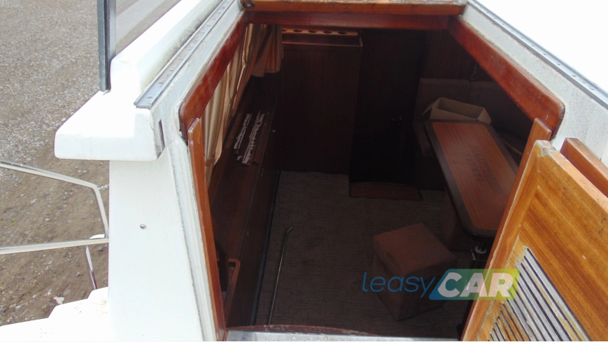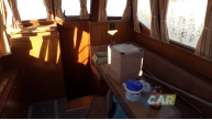 Deska rozdzielcza, koło sterowe oraz elementy drewniane na pokładzie z widocznymi uszkodzeniami, wynikającymi z braku konserwacji i działania czynników atmosferycznych;