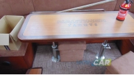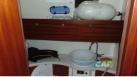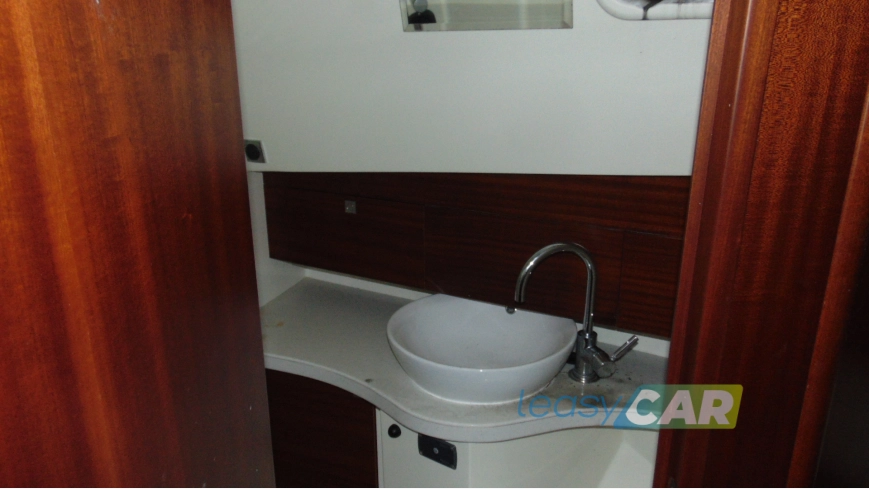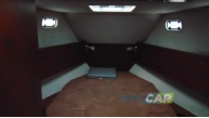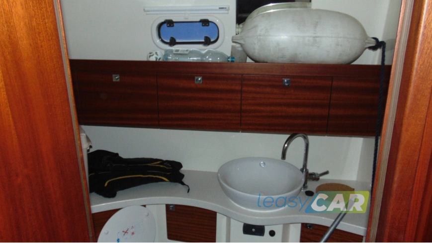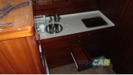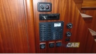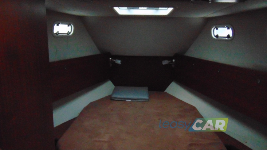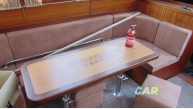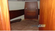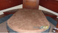 Zabudowa wnętrza jachtu z drewna i materiału drewnopochodnego, w kolorze mahoń, wykładzina dywanowa, oświetlenie;