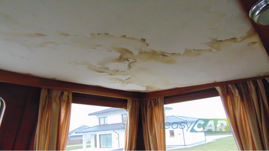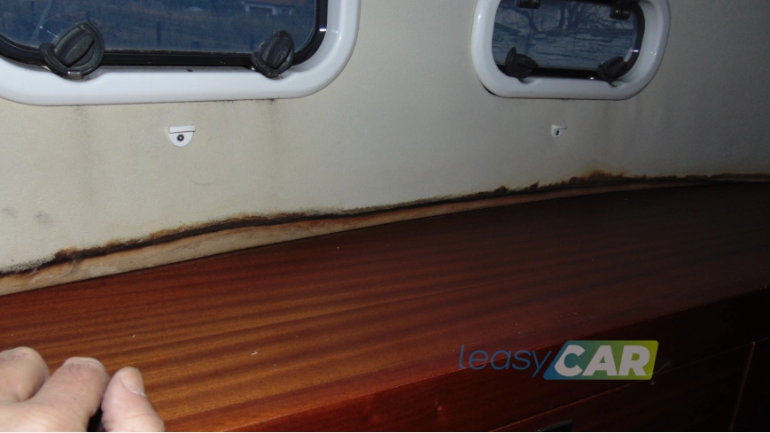 Wnętrze jachtu z widocznymi zabrudzeniami, zawilgocone, z licznymi zaciekami (ściany, podsufitka) i nalotem pleśni, widoczne liczne zarysowania drewnianej zabudowy, odpryski powłoki lakierowej, zdemontowane pojedyncze listwy przypodłogowe oraz metalowe uchwyty, relingi, elementy tapicerowane, materace, wykładziny zawilgocone;